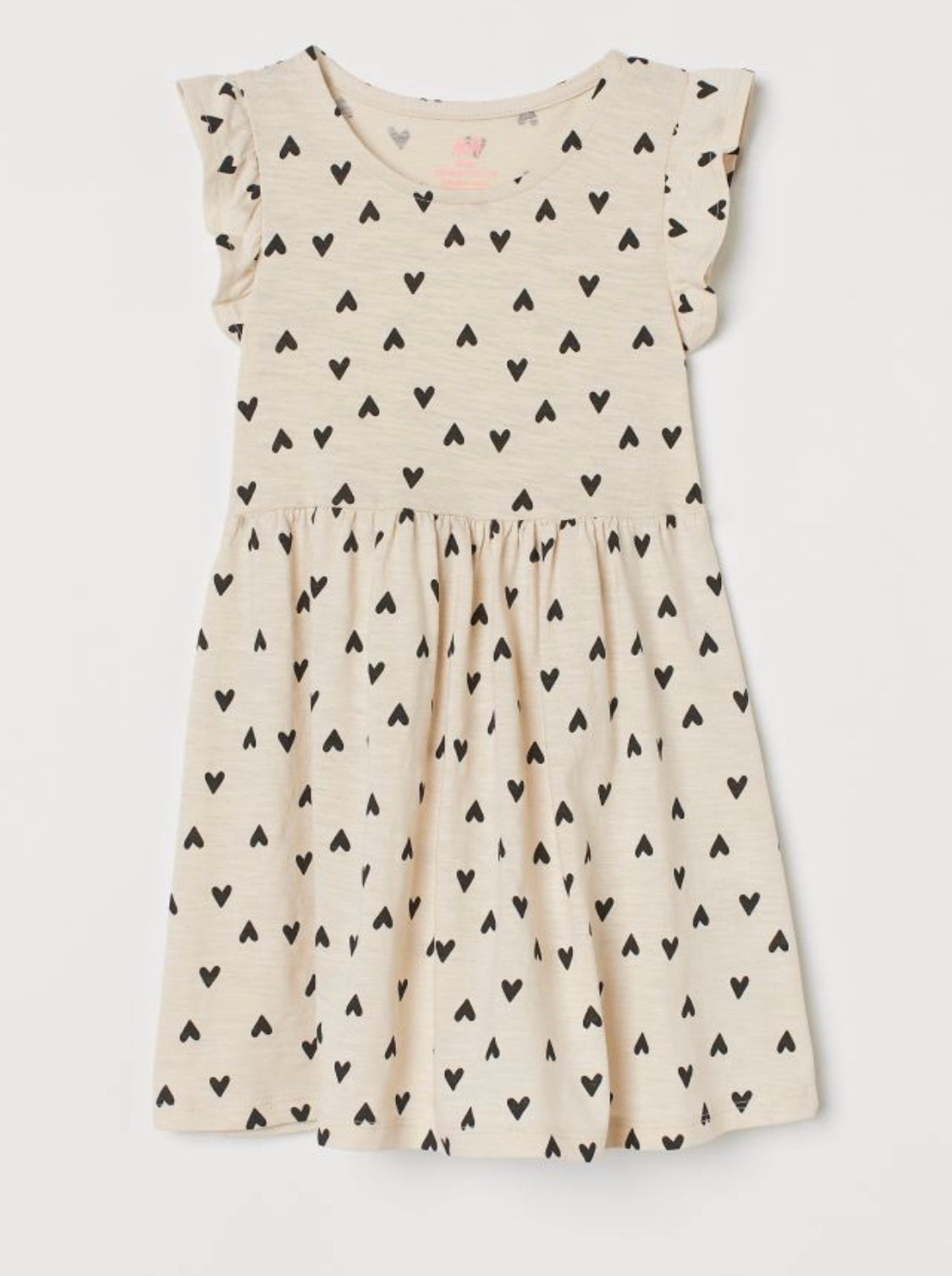 Dress in soft, organic cotton jersey with flutter sleeves. Elasticized seam at waist with decorative gathers.