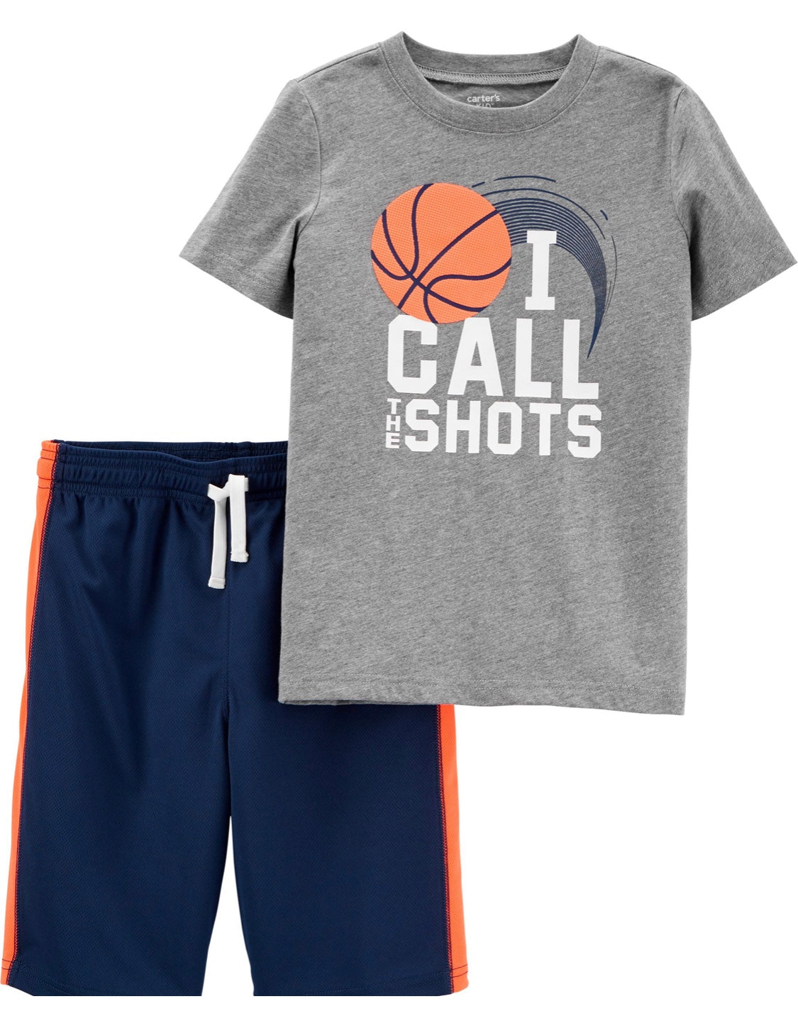 Perfect for your sporty one, this set is complete with a cool slogan tee and a pair of pull-on shorts to match.
