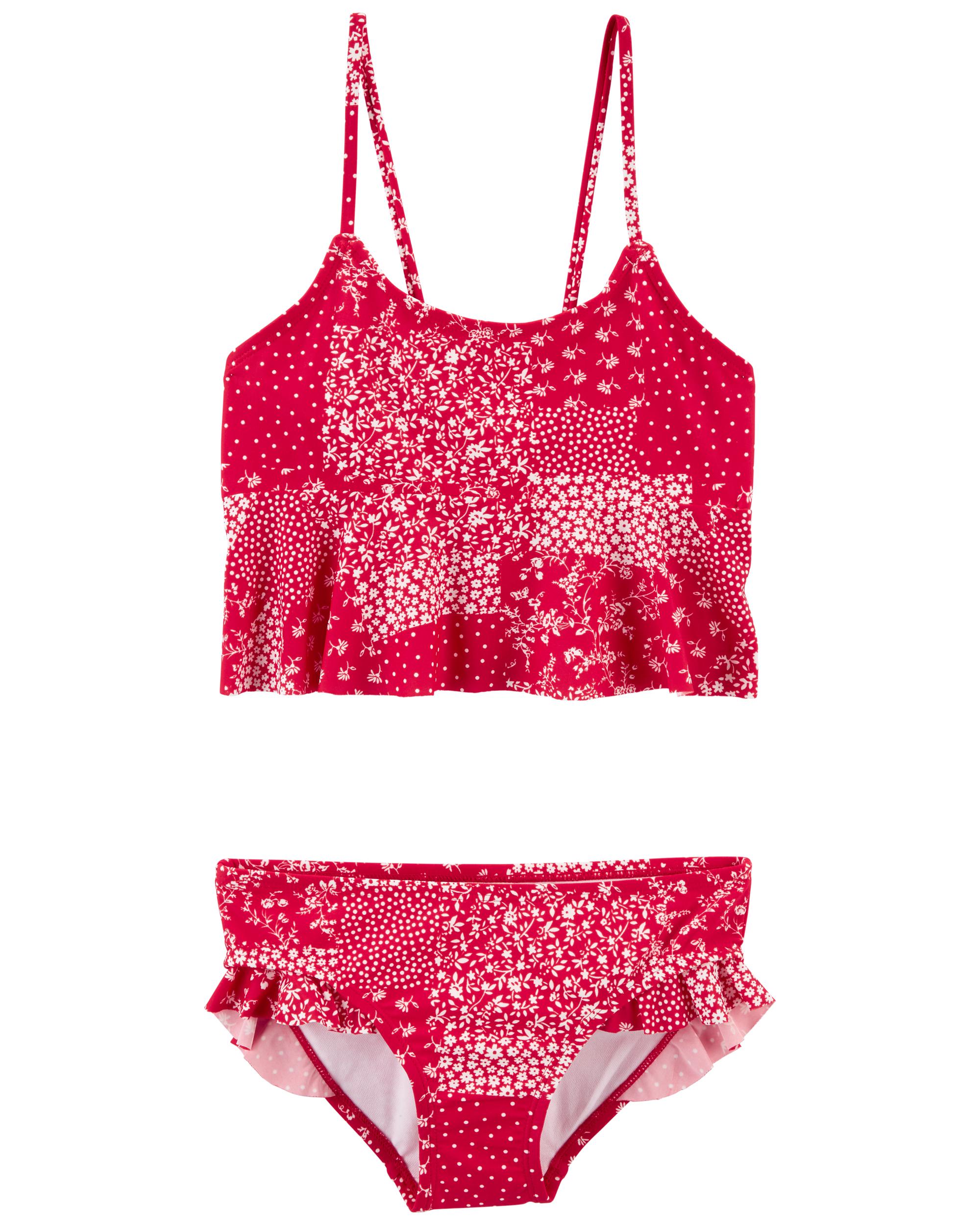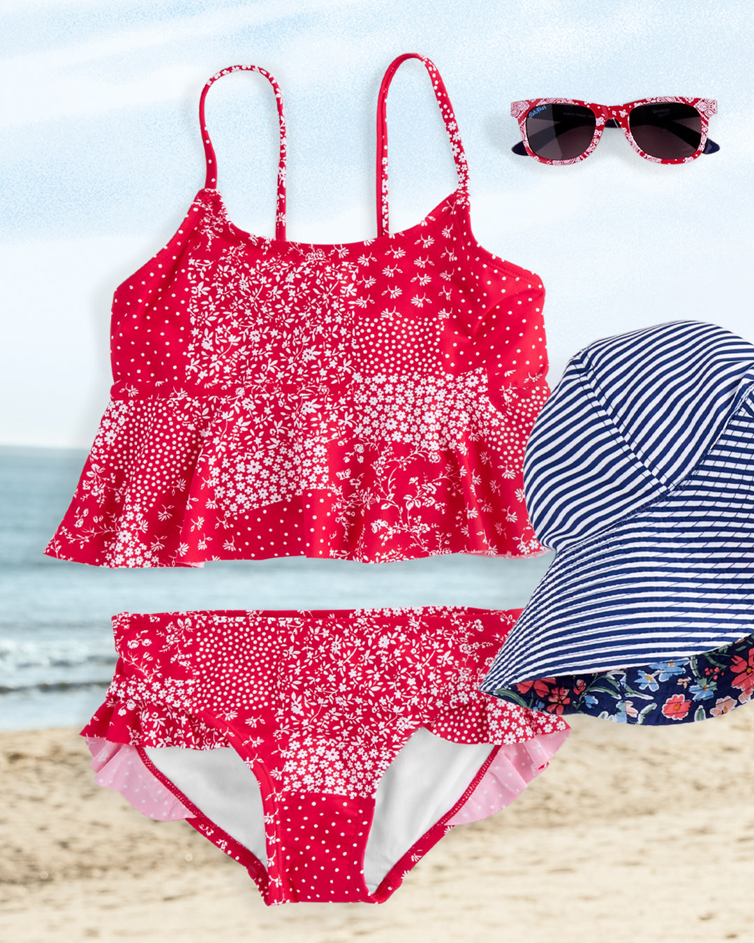 Featuring a fun ruffle hem and pretty patchwork design, this two piece tankini gives her super sweet pool day style. Plus, with built-in UPF 50+ sun protection and a full lining, this suit helps keep her covered from sun rays.