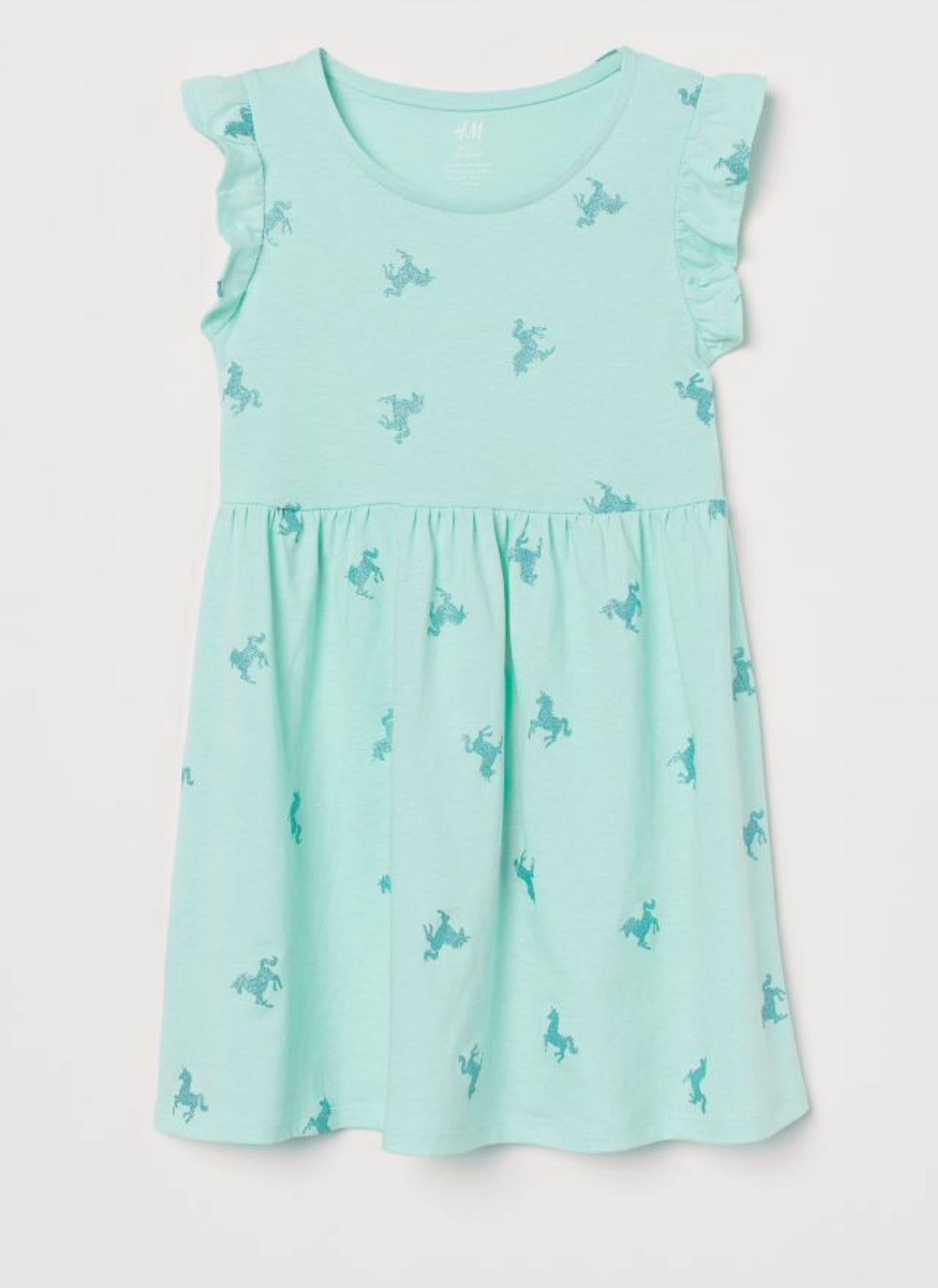 Dress in soft, organic cotton jersey with flutter sleeves. Elasticized seam at waist with decorative gathers.