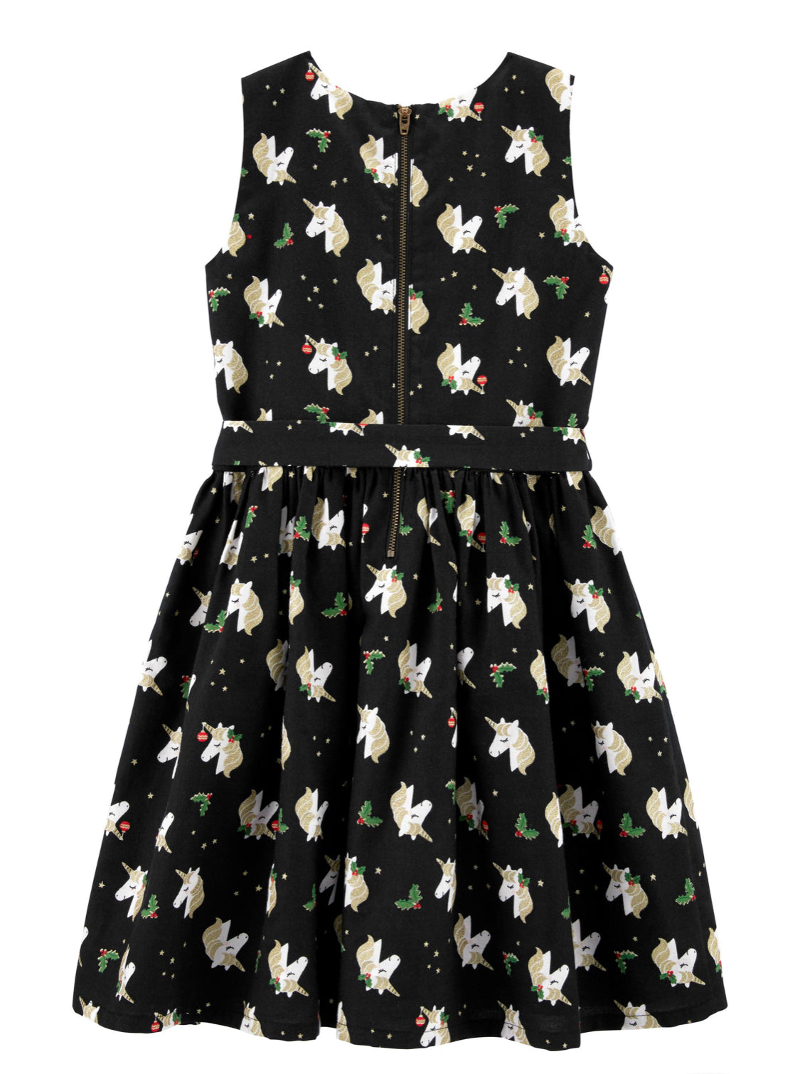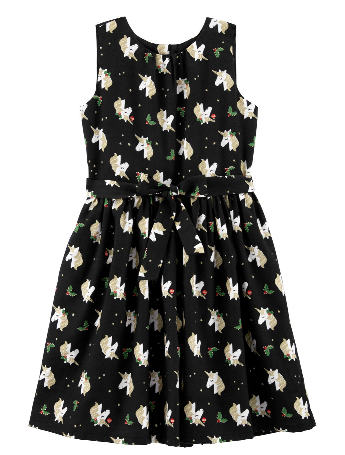 With holiday inspired unicorns allover, this twill dress is perfect for Christmas parties and beyond with front sash tie.