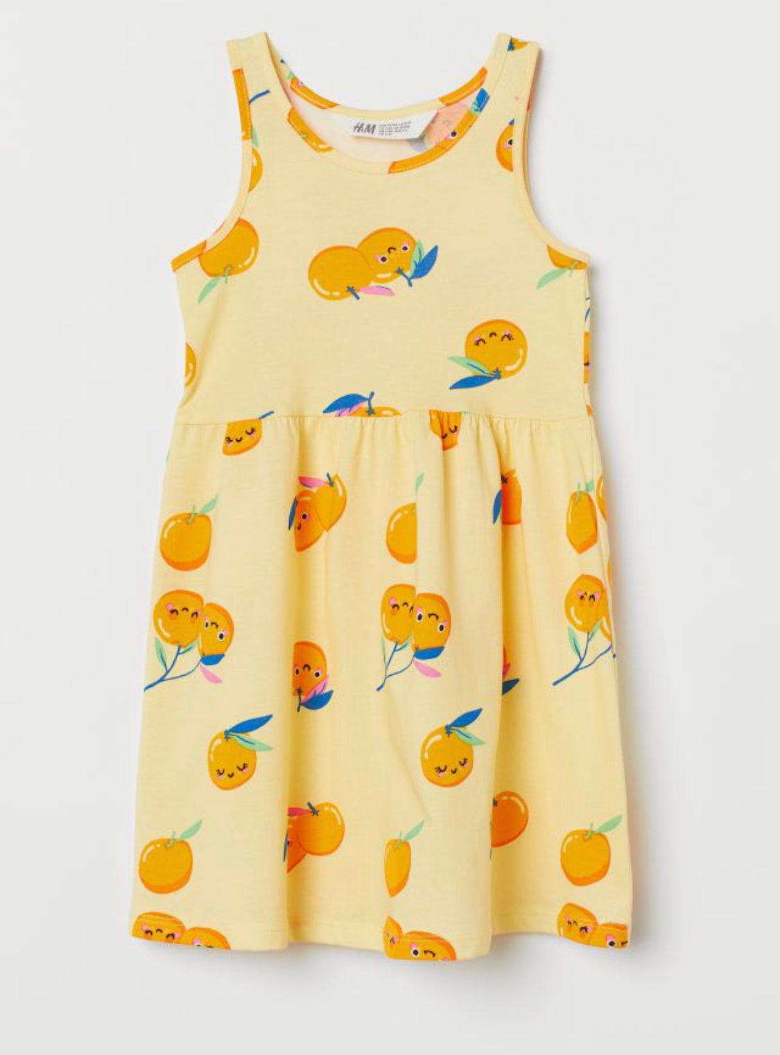 Sleeveless dress in cotton jersey with a printed pattern. Gathered seam at waist and flared skirt.